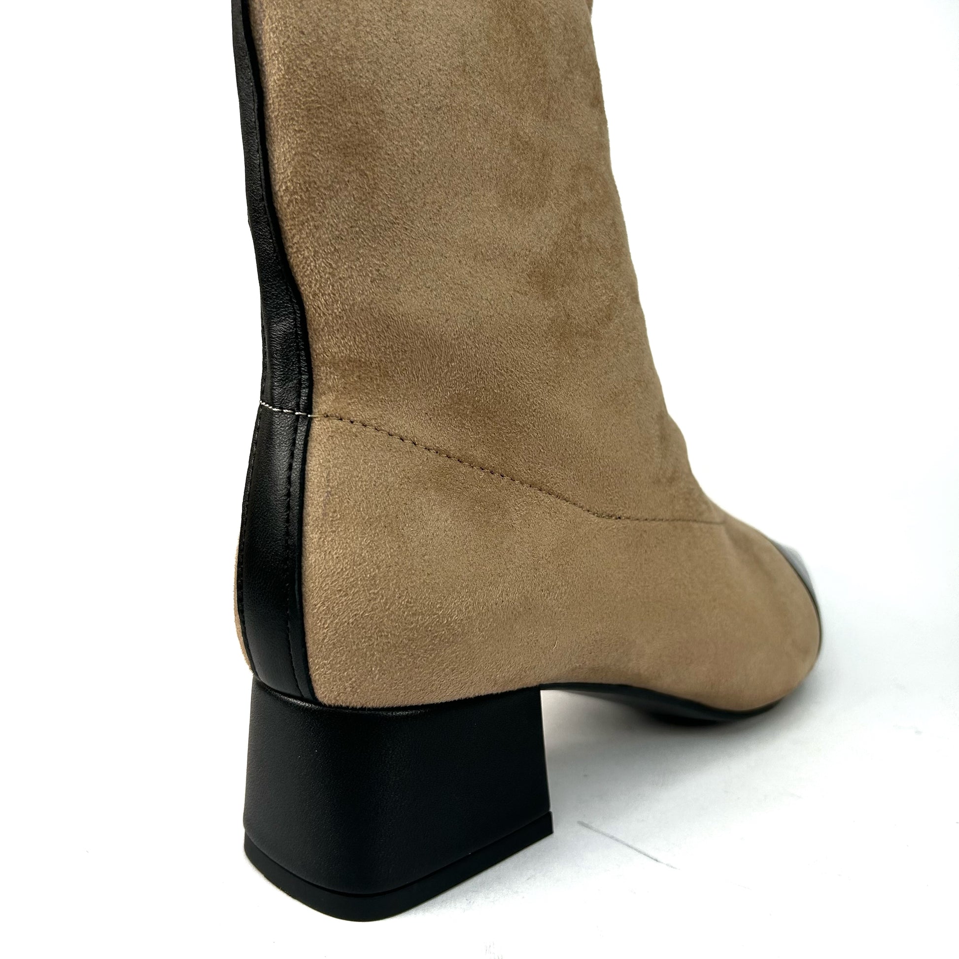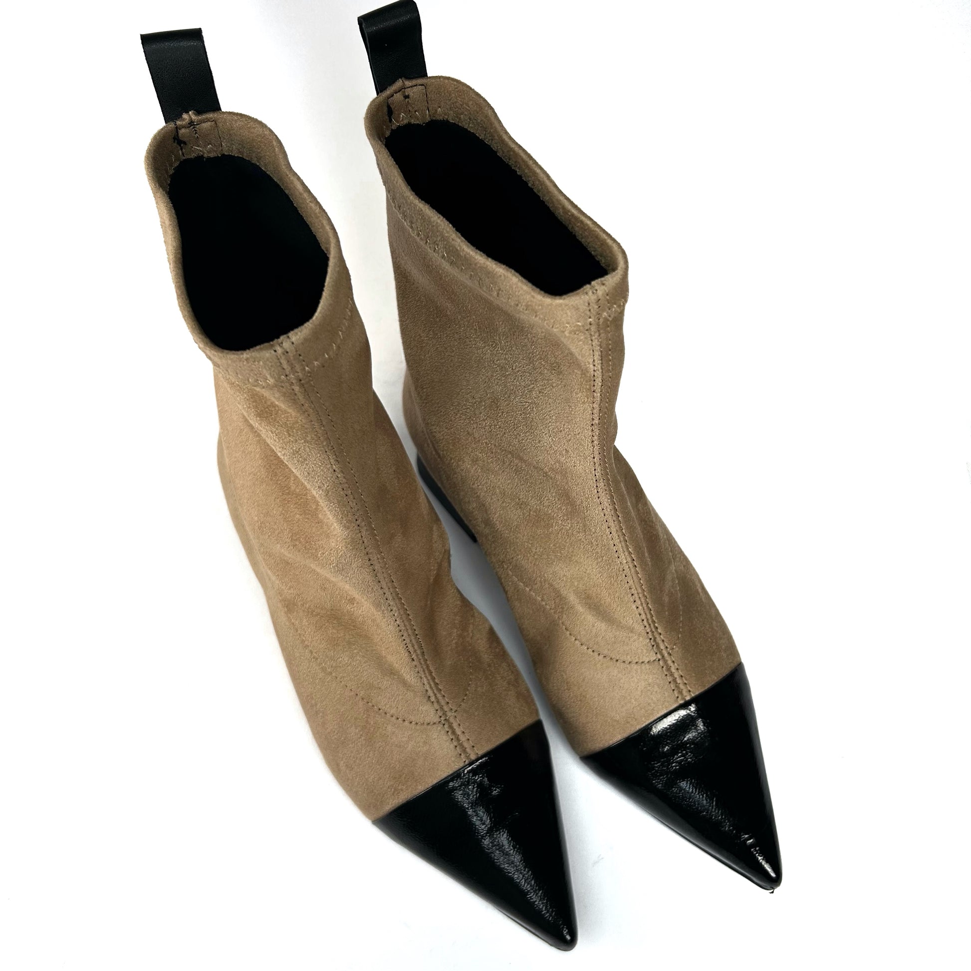 -Botín de mujer de licha en ante camel y punta y tacón a contrate en charol negro.