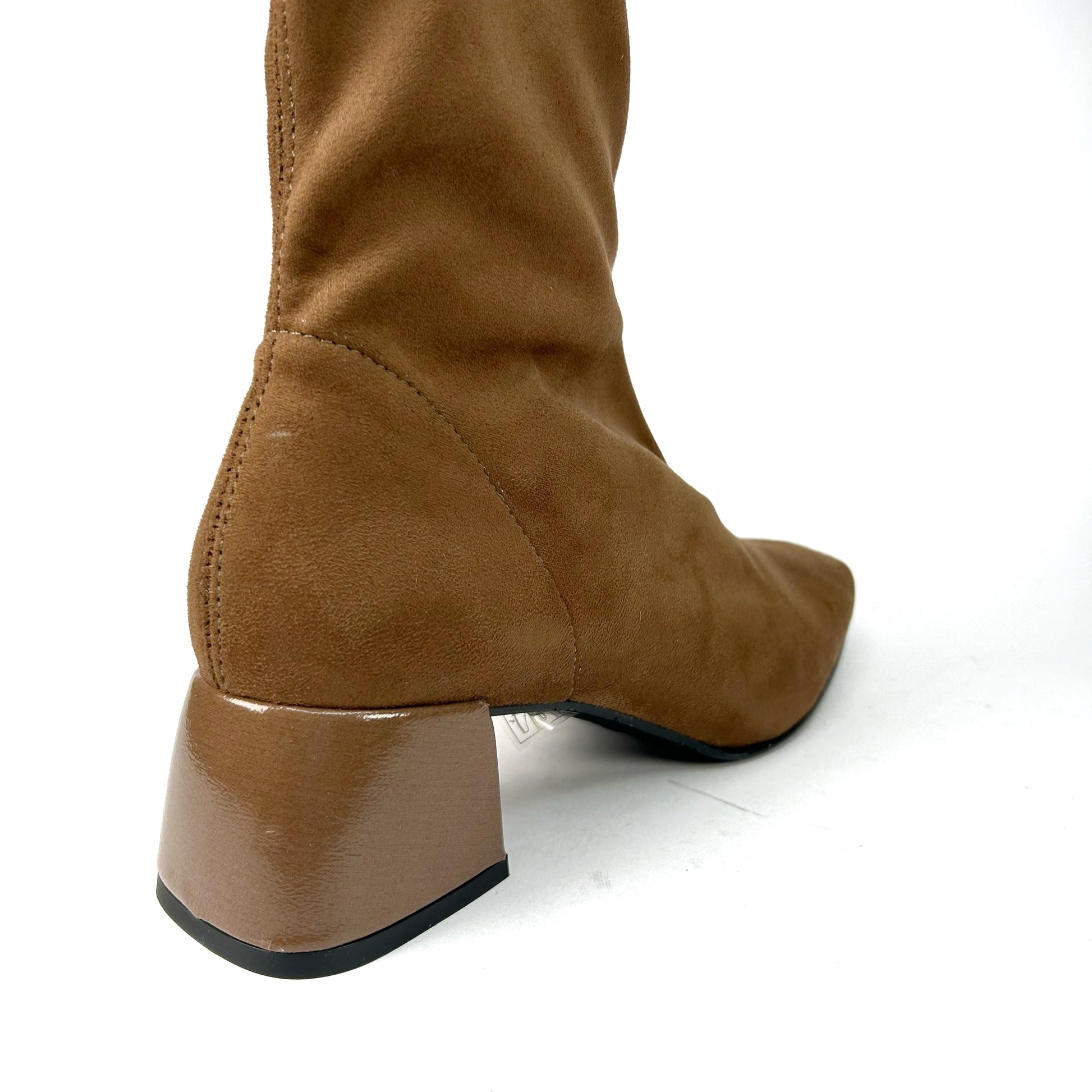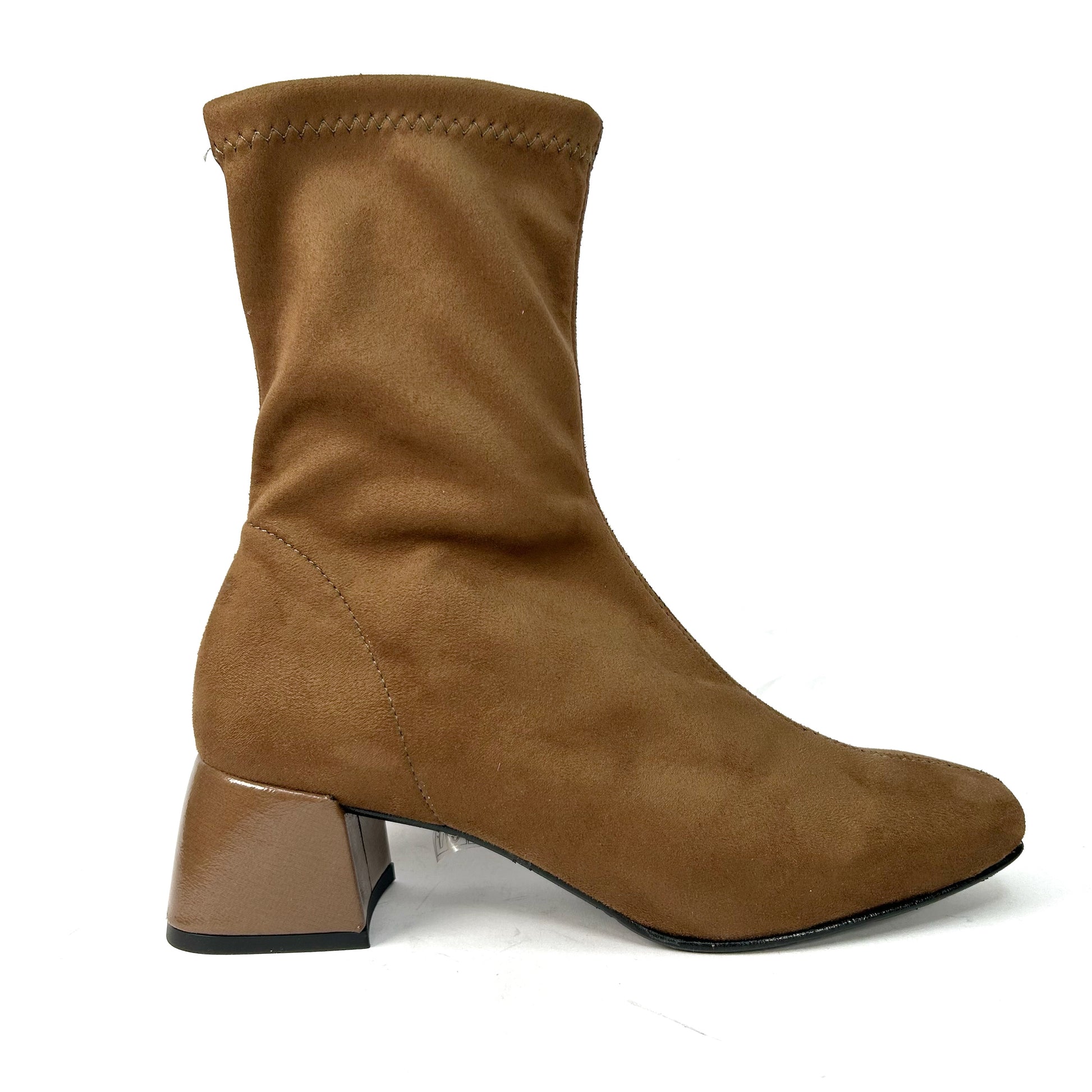 -Tacón ancho forrado en krokante con un poco de brillo que contrata con el resto del botín en ante. Altura de unos 5 cm, perfecto para usar todo el día.