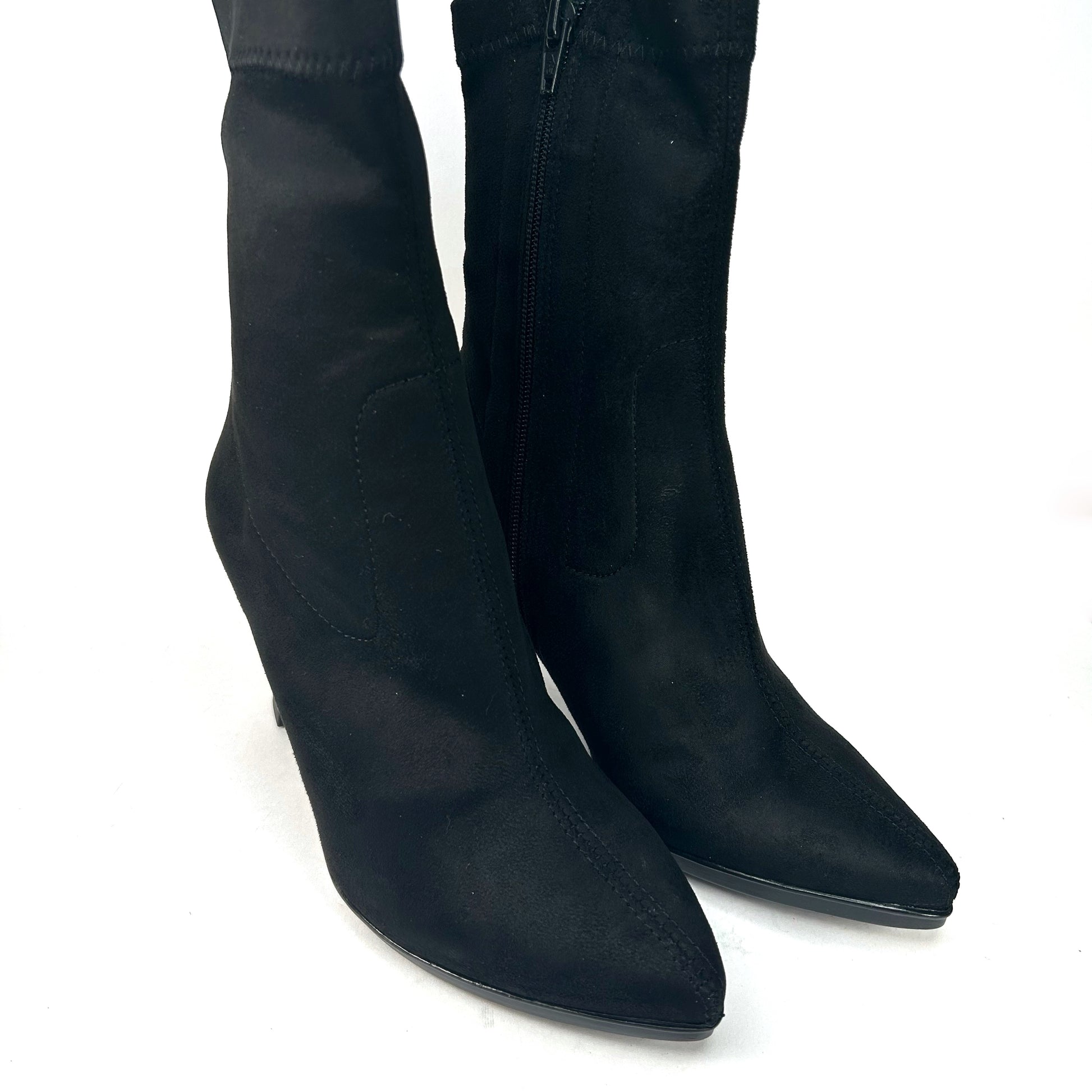 -Botín de tacón alto y punta fina, con pequeña plataforma de goma en la parte delantera.