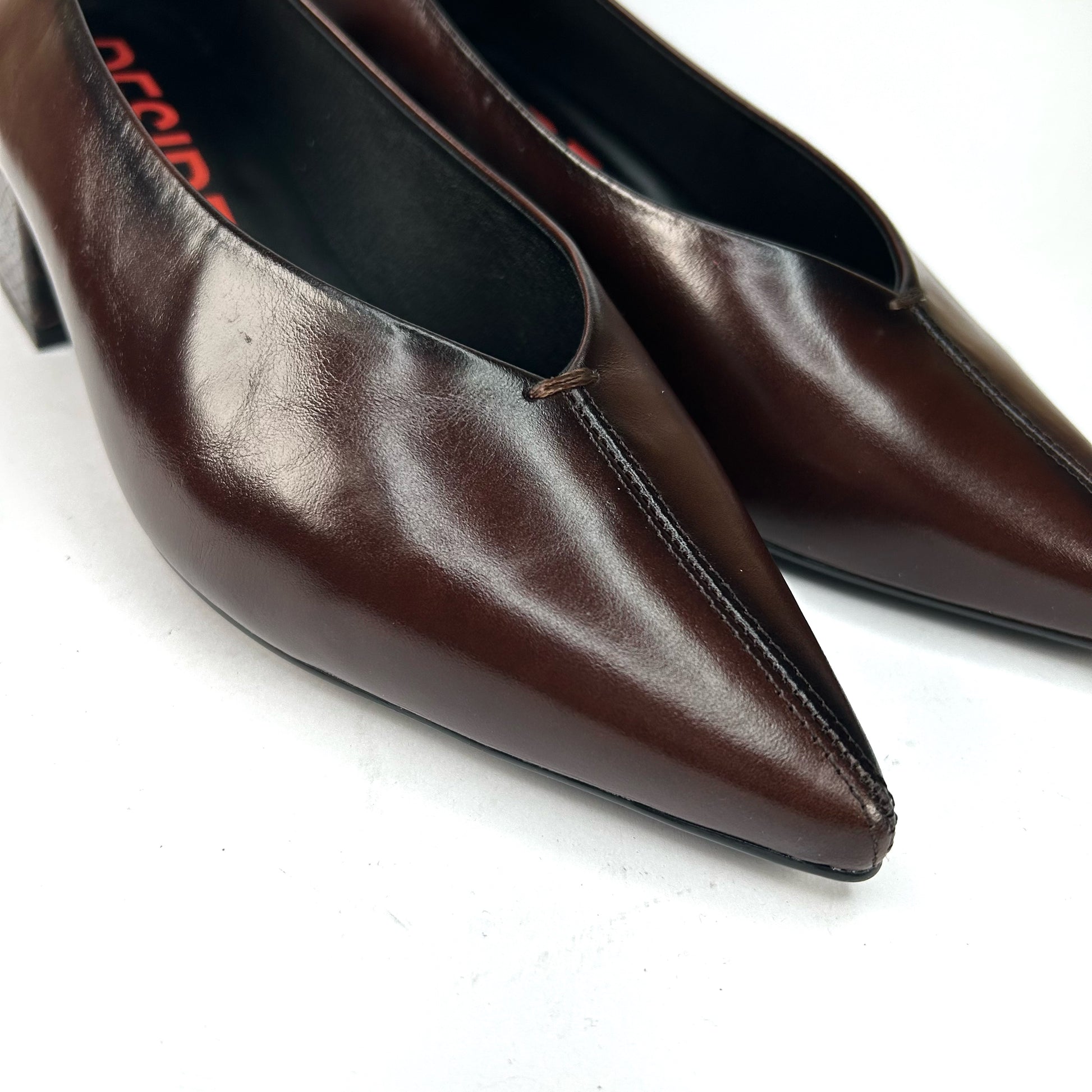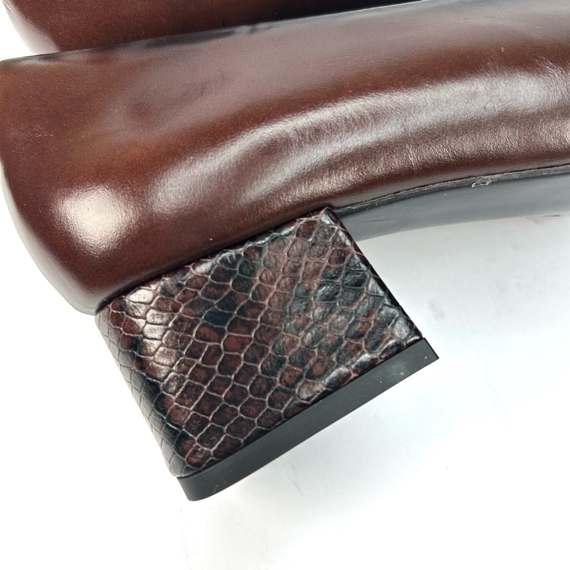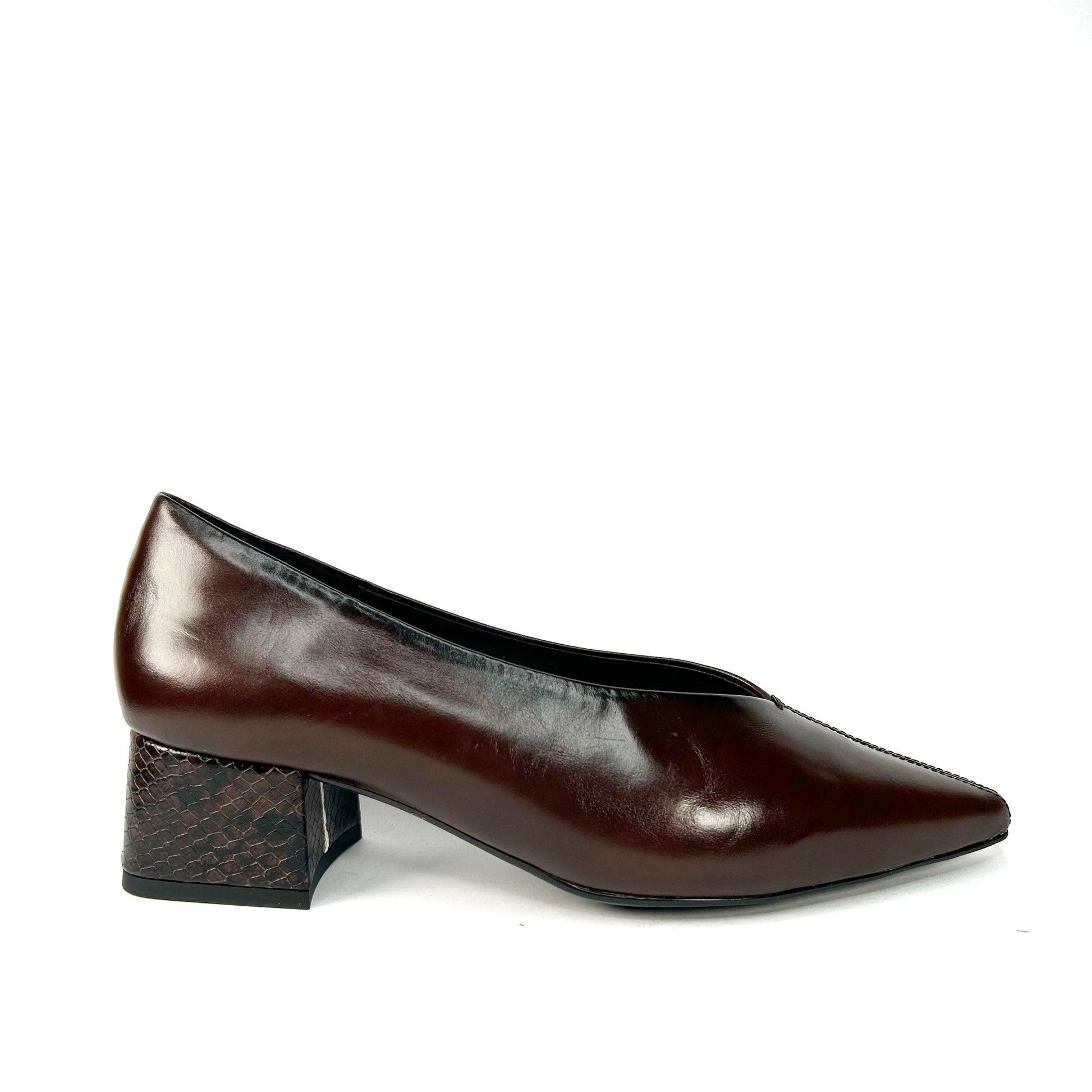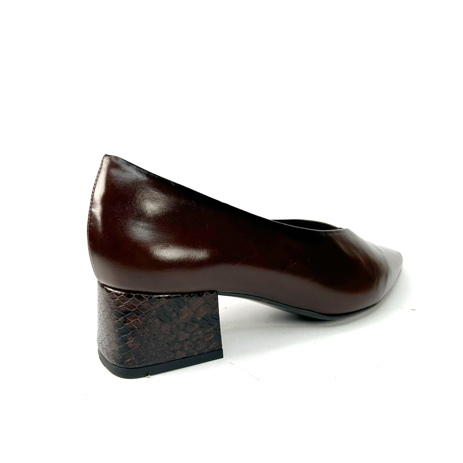 -Zapato de salón de punta fina, con tacón grueso y piel de serpiente al tono