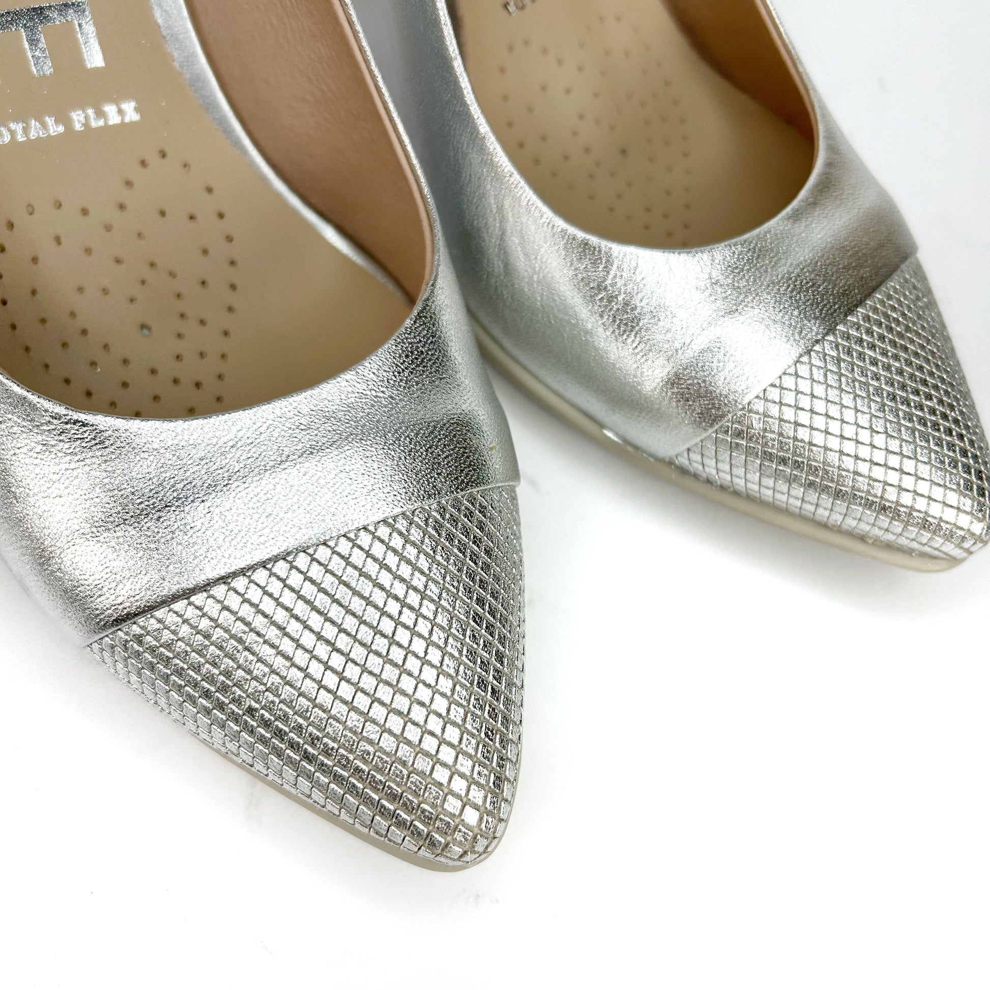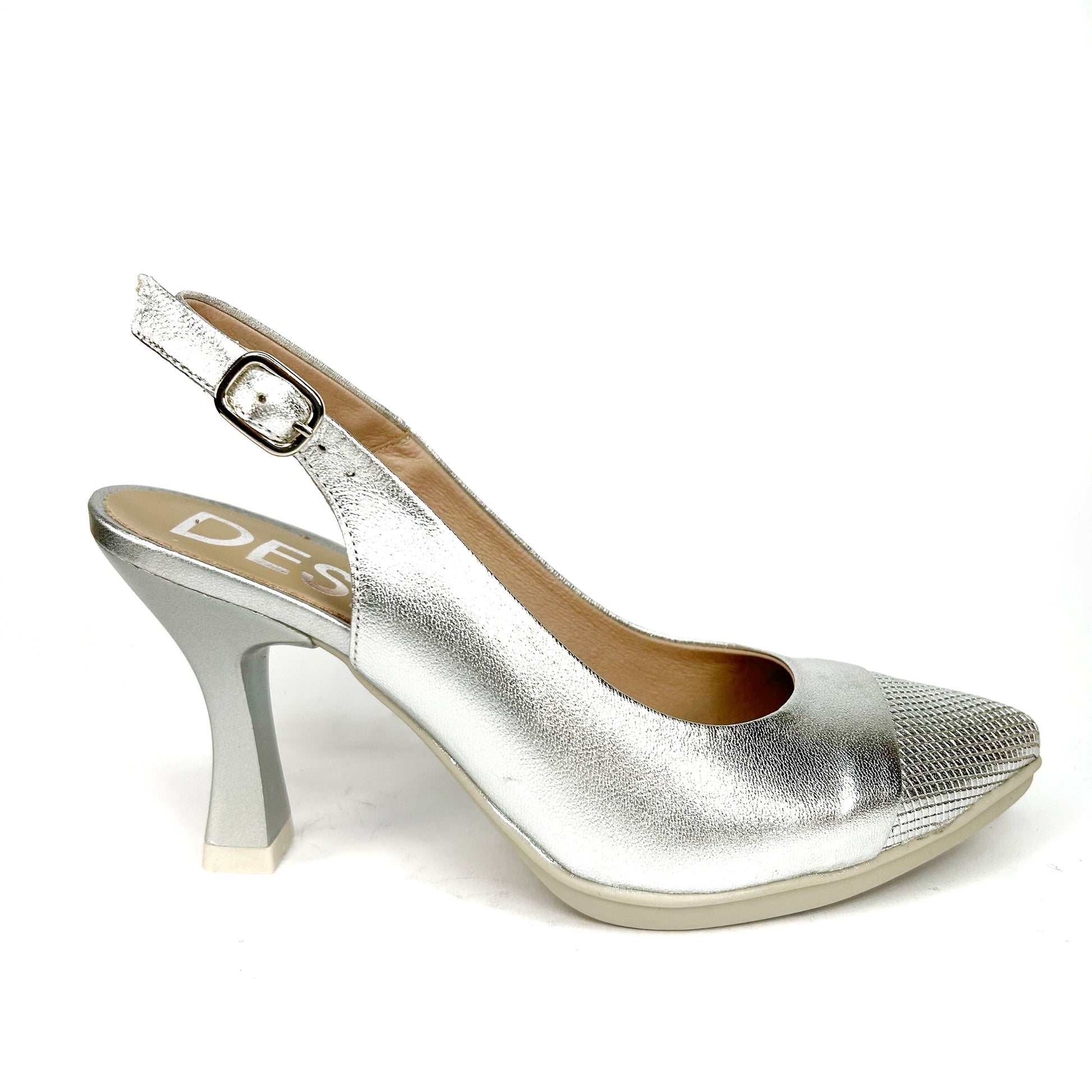 -Zapato de salón destalonado y de punta fina, con pequeña plataforma de goma en la parte delantera. Tacón de 6,5 cm, color plateado con la punta en serpiente al tono.