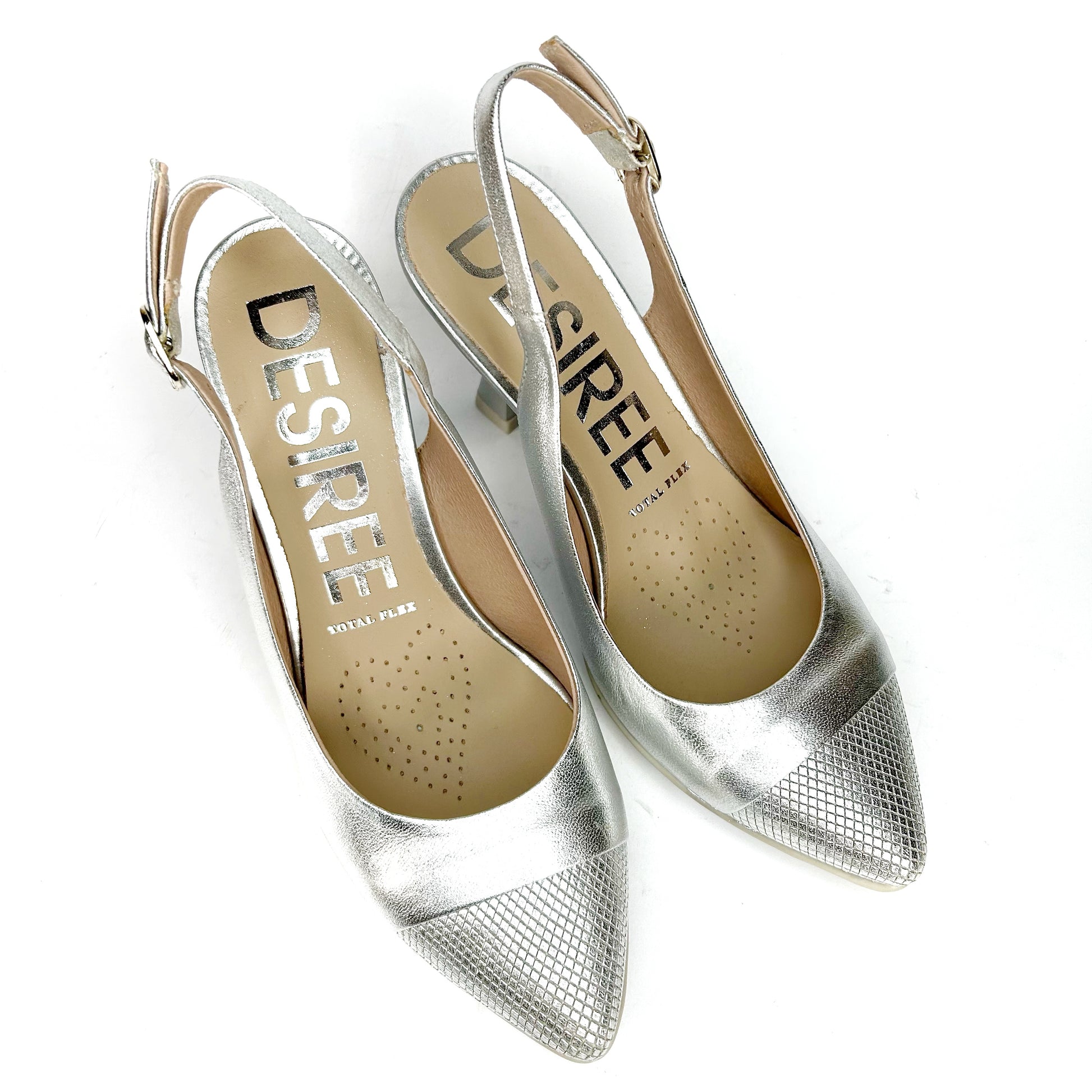 -Fabricado en piel naturales de la mejor calidad, suaves y transpirables. En este caso es metalizada en tono platino, y la mitad del zapato lleva la piel grabada tipo serpiente.