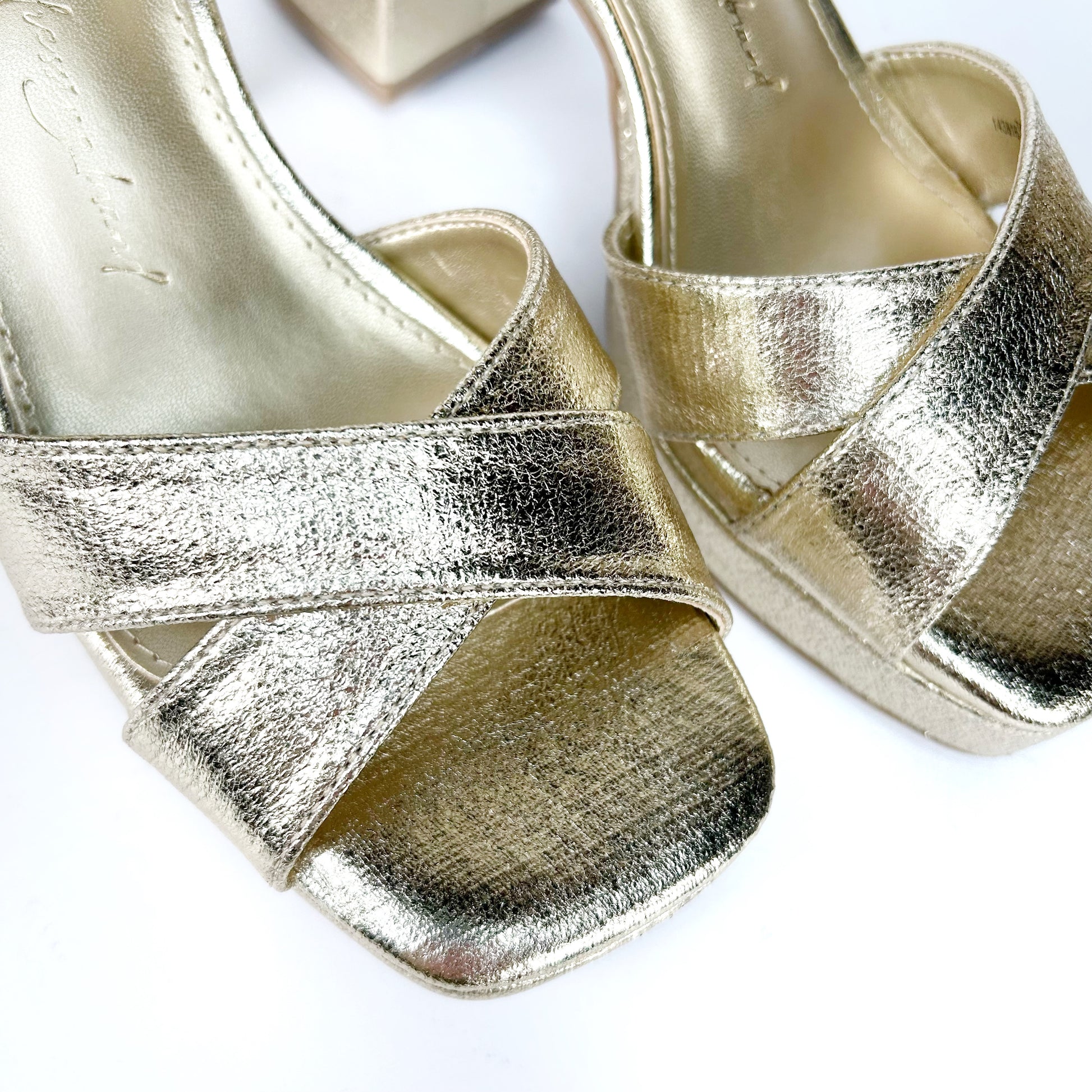 -Sandalia fabricada en acabado metalizado oro, con piel sintética grabada.