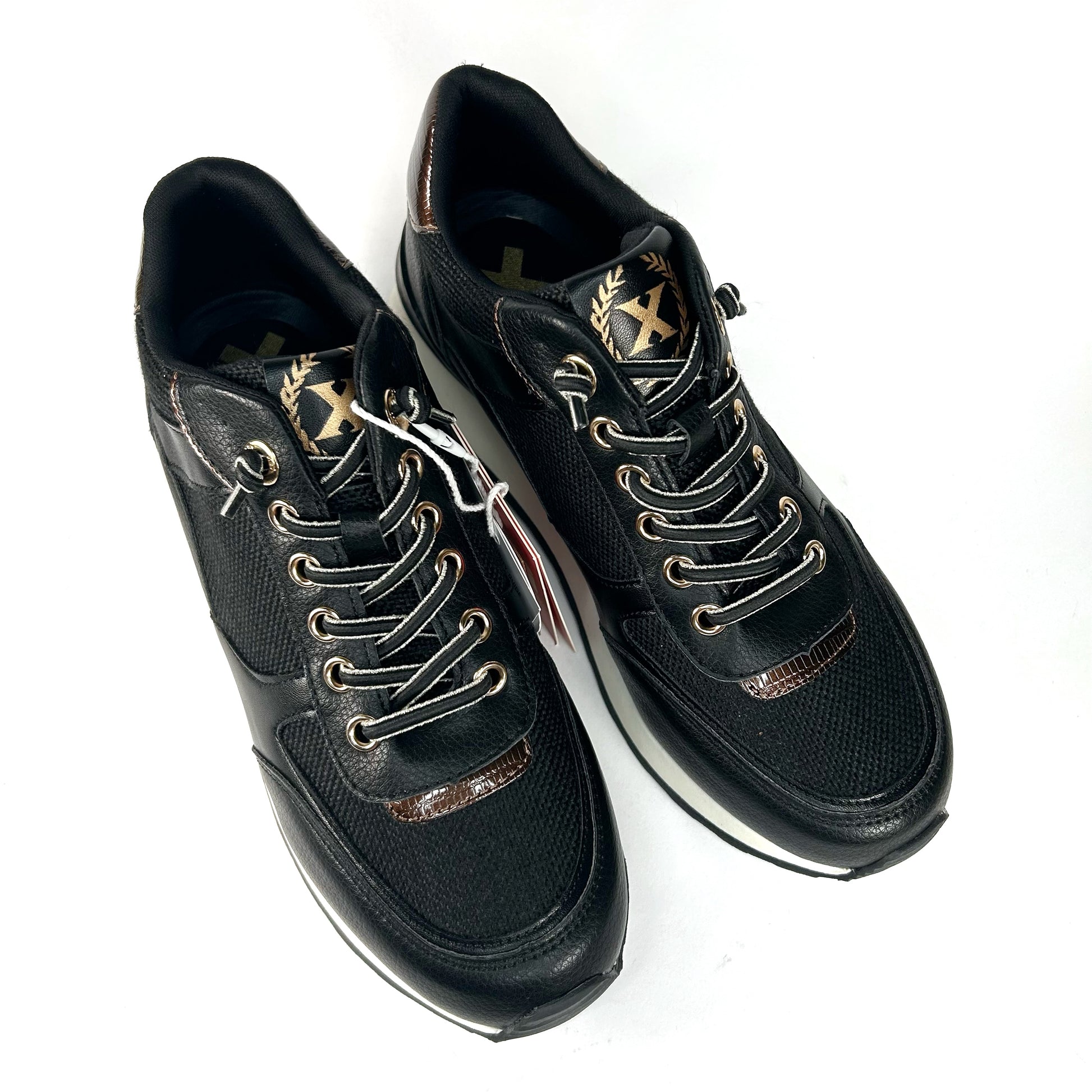 -Zapatilla de mujer de la marca Xti, fabricada en material textil combinado con material que imita la piel, con detalles metalizados que aportan un toque elegante y moderno.