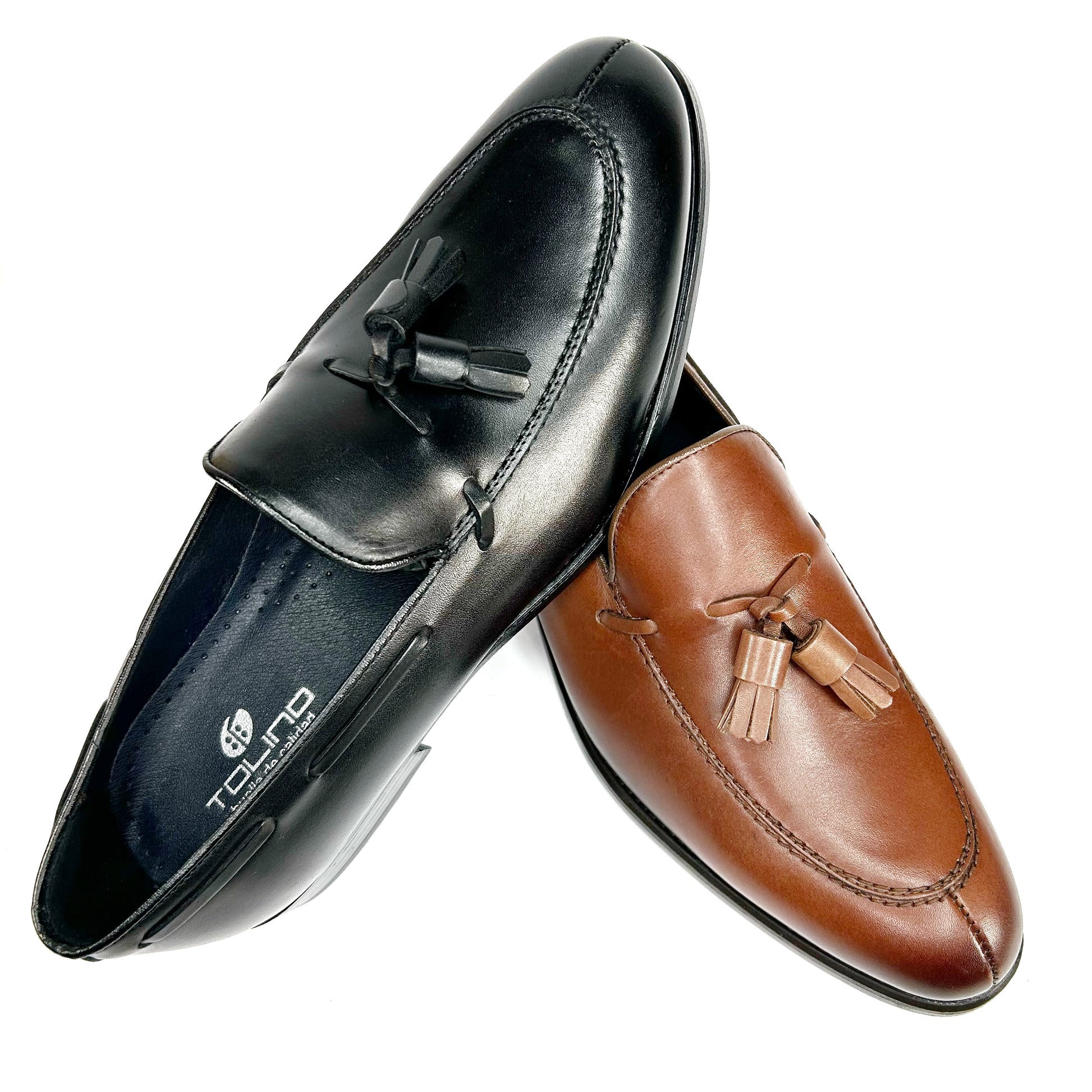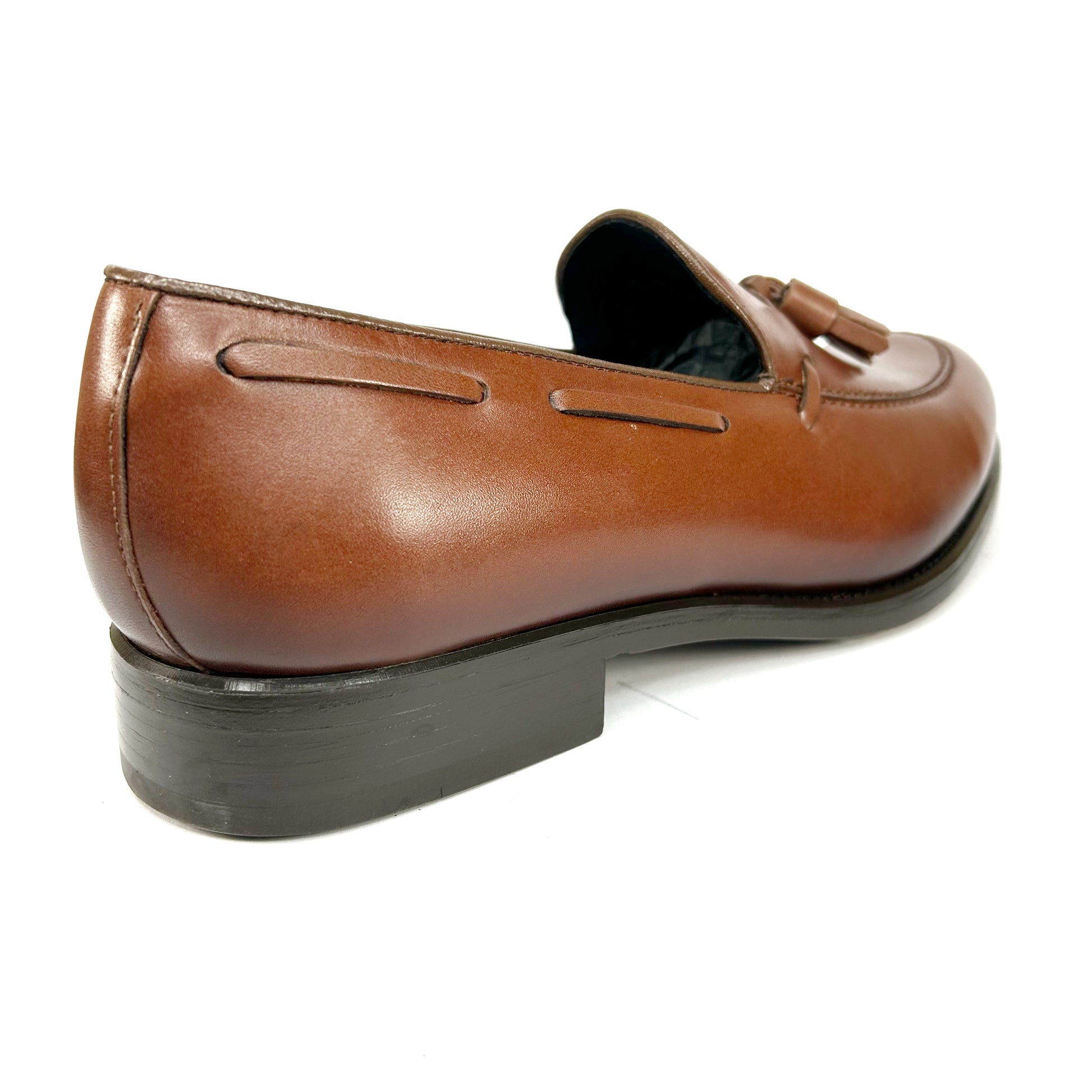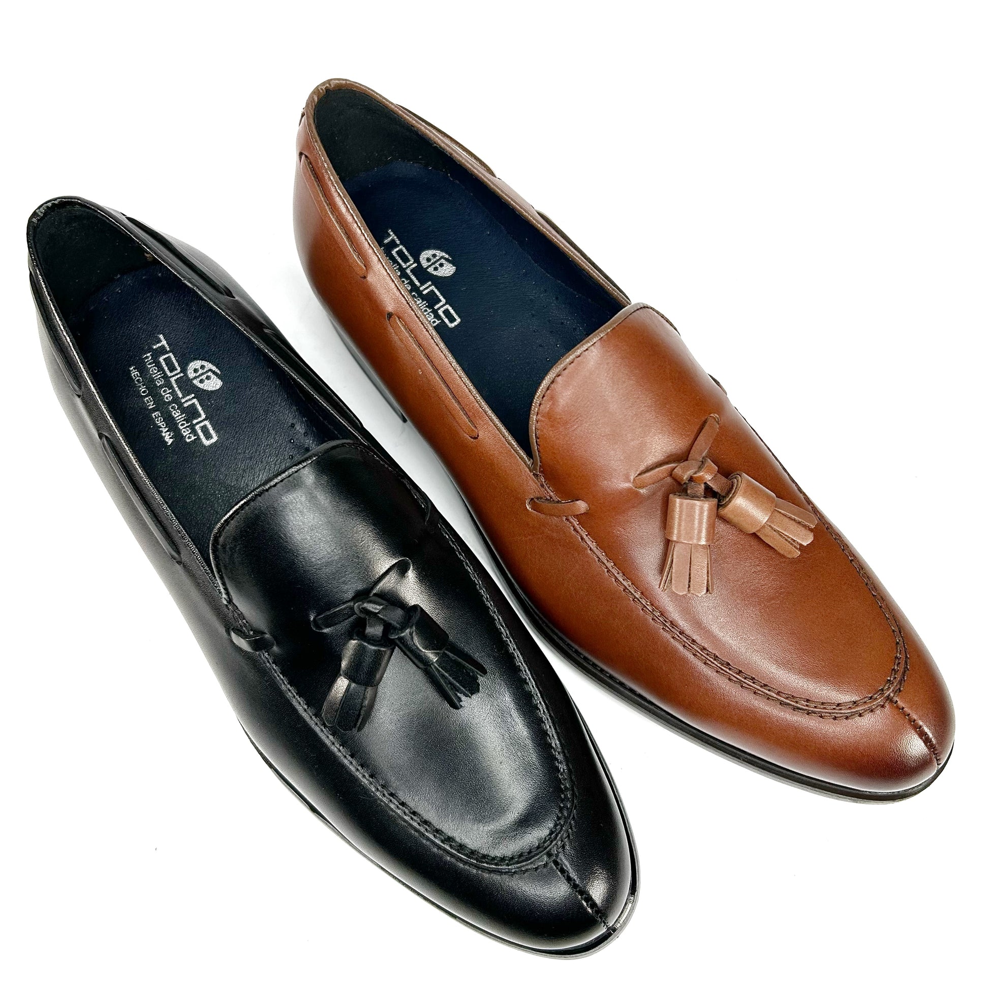 -Piel de calidad, vacuno soft, color cuero con borlas y pasado lateral.