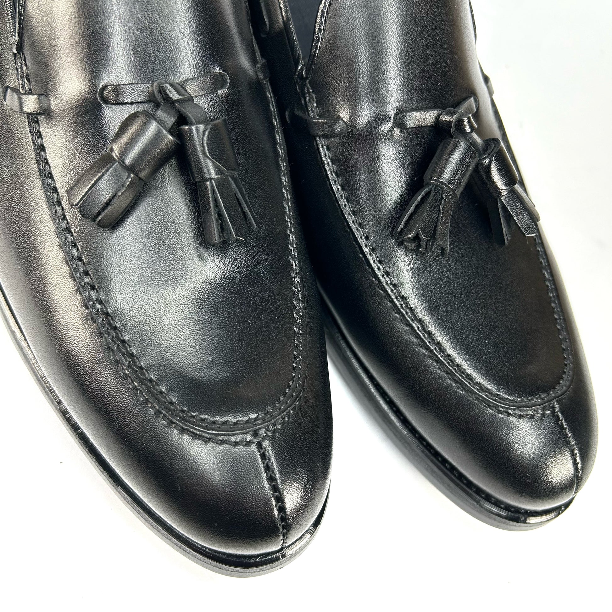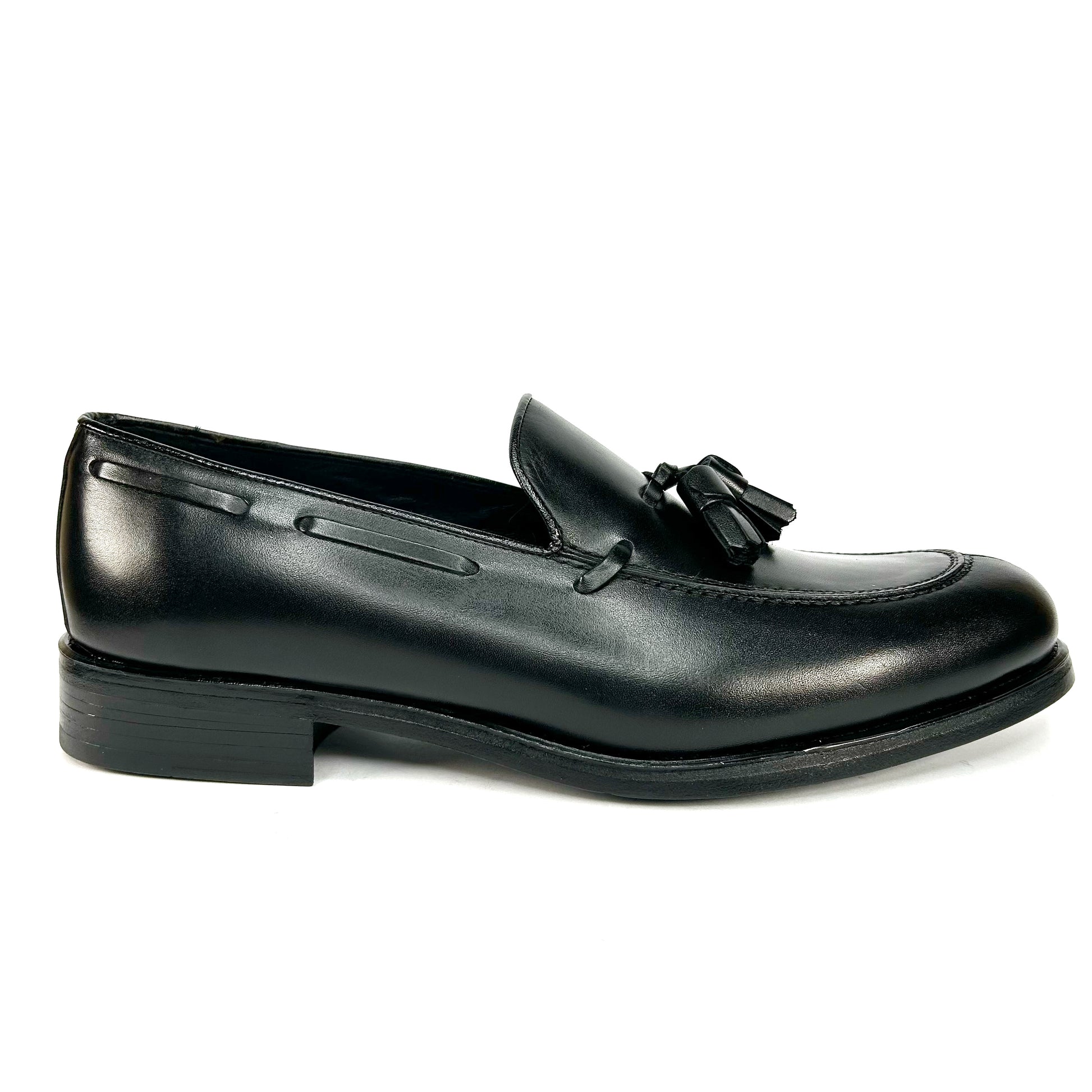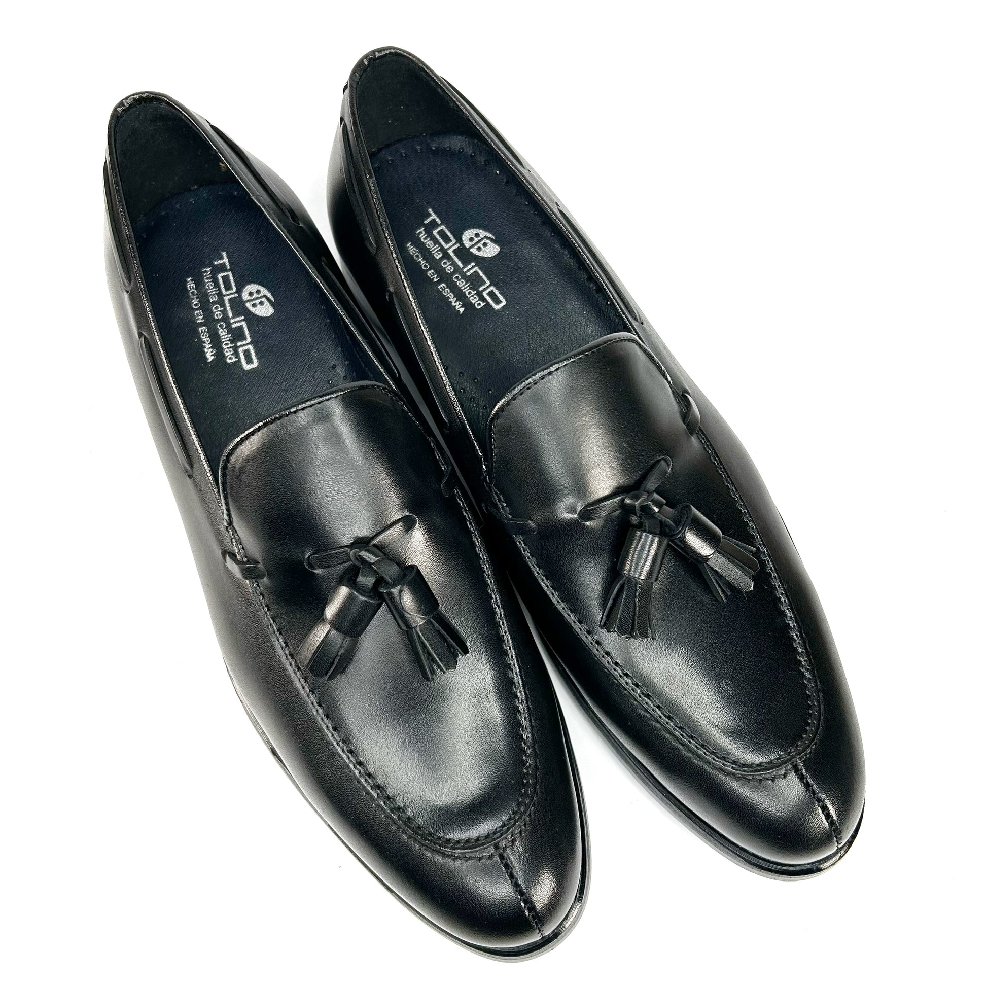 -Piel de calidad, vacuno soft, color negro con borlas y pasado lateral.